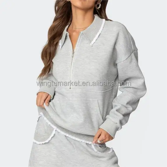 Wholesale American Style Grey 1/4 Zip Hoodie White Ruffle Lace Trim Collar Women Pullover